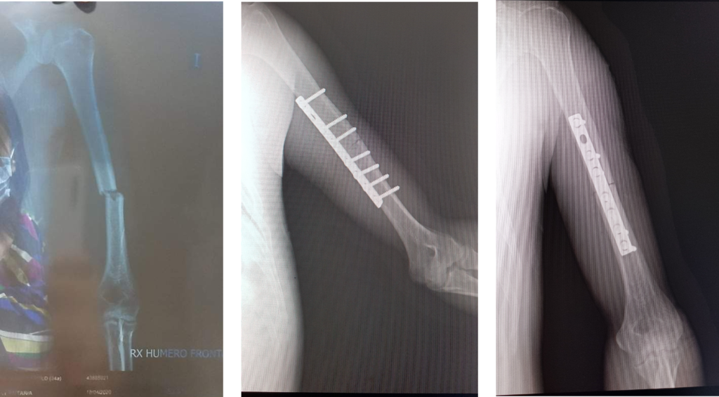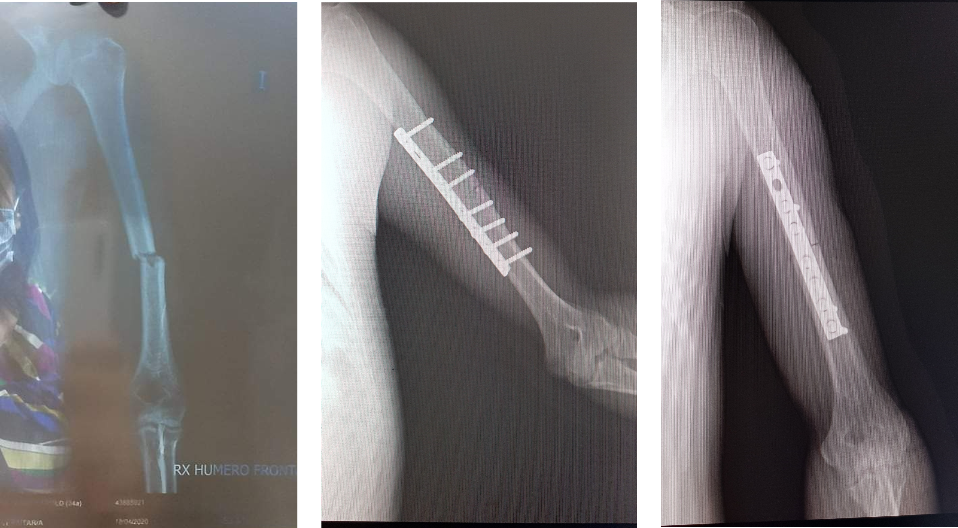 Paciente varón de 34 años de edad con antecedente de caída en vía pública. Cae al resbalar sobre piso mojado mientras usa sandalias. Dx fractura de húmero diafisiario izquierdo el día 18/04 operado el 07/05 del mismo año.